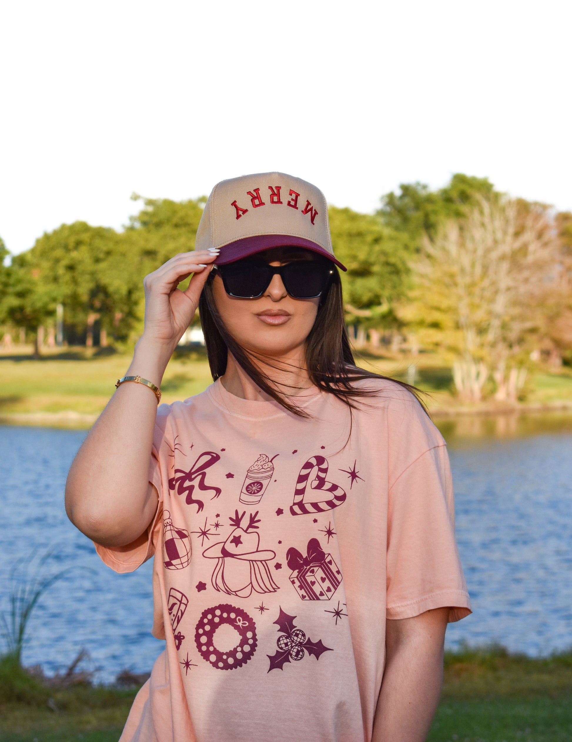 The Merry Two-toned, Upside-down Hat in light beige and burgundy color features a classic fit with an adjustable back and "Merry" embroidered.